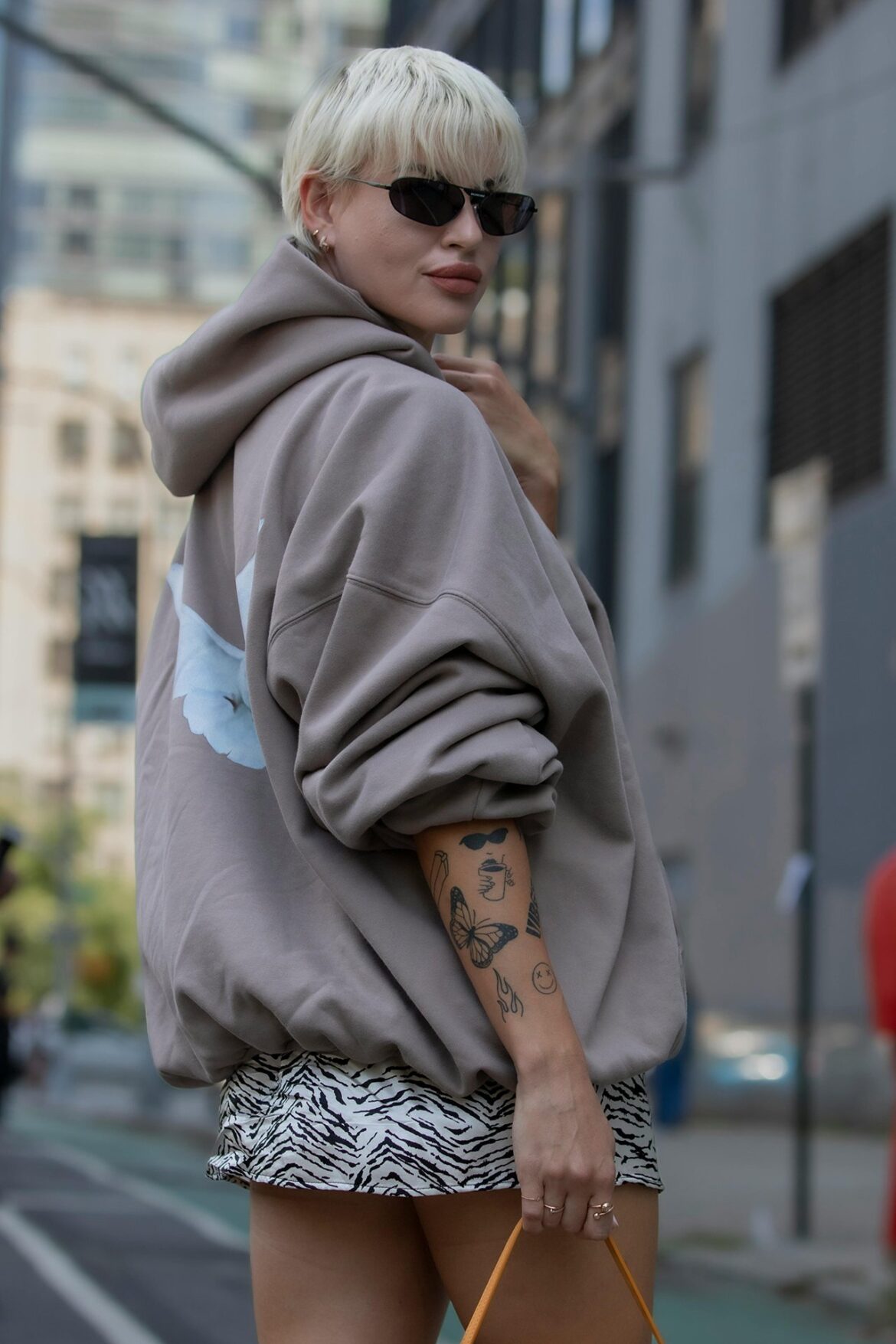 Matching sets are always a winning choice, and if you want an easy way to rock suede, coordinating pieces are the way to go. Sasha looks absolutely stunning in a suede jacket paired with a matching mini skirt, crafting the ideal fall outfit. To keep things seasonally appropriate, she completes her look with sheer tights and stylish chocolate heels, creating an ensemble that’s sure to turn heads.